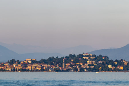 Panoramic view of Maggiore lake with Arona town and Angera castle, Italy