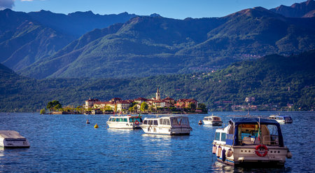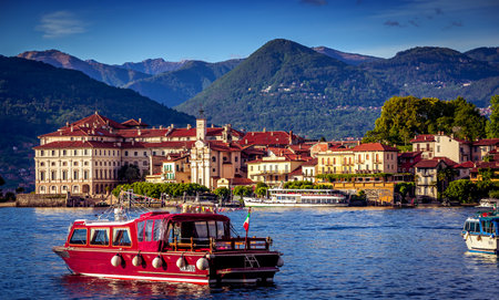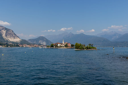 Stresa, Lake Maggiore, Italy. Lakeside of Stresa, in the middle, the island Bella and in the background the Alps. Picturesque view of the Borromean Gulf, famous tourist destination in Italy