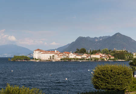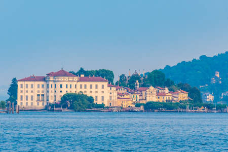 Islands and buildings in evening. Sky, mountains and water. Visit Isola Bella in summer.