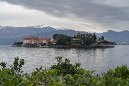 Isola Bella on Lake Maggiore, italy with view of the island and Palazzo Borromeo on a cold winter day. Snowy mountains in the background.