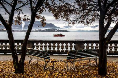 Lake Maggiore side scene with unrecognized people relax on bench in Locarno, Switzerland
