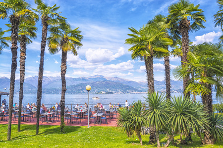 Stresa, Italy - April 11, 2017: Outdoor restaurant with beautiful view on Lake Lago Maggiore in the background of the Alps Mountains in resort town of Stresa, Italy.