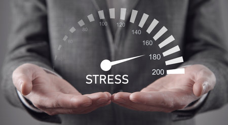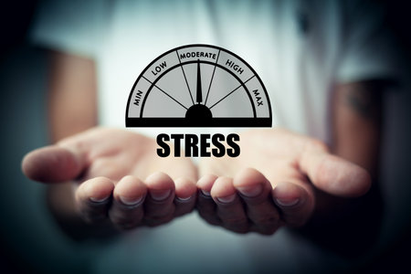 Hands holding a card with the word stress symbolize the challenge of managing stress and finding balance. The image reflects concepts of stress relief, time management, and personal growth