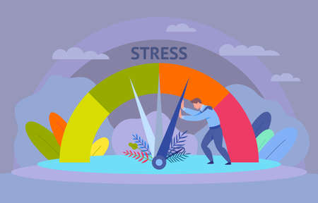 Stress, high pressure, exhaustion, work life balance, low energy level, arrow pointing to red critical scale, loading bar