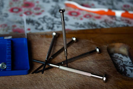 Small screwdrivers set in a blue plastic box on a wooden cutting board with some screws around them. Order of technology. Strength of standing alone in community.