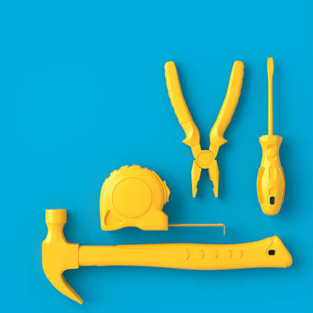Top view of monochrome construction tools for repair on blue and yellow