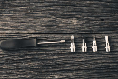 Screwdrivers and other tools for reparing smsartphones on black background.