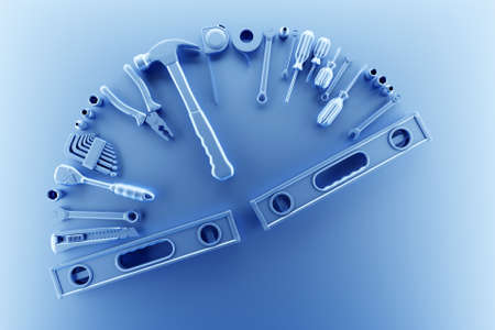 3D illustration blue hand tools: screwdriver, hammer, pliers, screws, etc. for handmade. various working tools. Construction, construction, renovation concept.