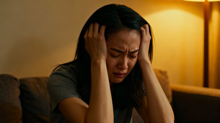 A person with closed eyes grips their head, expressing deep stress and anxiety in a tranquil, softly lit space.
