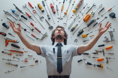 A handyman stands confidently with various tools in each hand, surrounded by an array of instruments. Skills displayed include plumbing, electrical work, and painting.