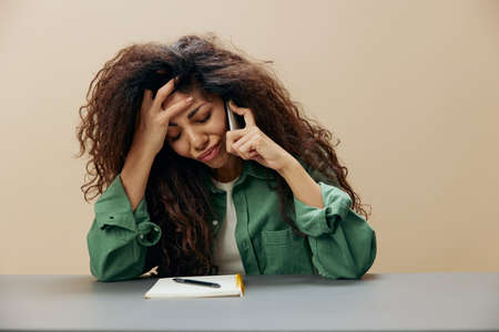 Sad frustrated upset tanned curly Latin lady talking with phone recline on hand sit at the table isolated over pastel beige background close eyes. Copy space Mockup Banner. Concept shock info in call