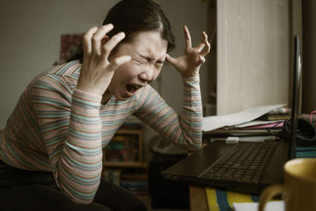 lifestyle portrait of young stressed and worried Asian Japanese woman working from home or studying exam in stress at home office feeling frustrated and tired