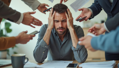 A stressed businessman sits at a cluttered desk, his hands gripping his head as multiple hands reach out with phones and documents. This image captures the intense pressure of modern work life, illustrating the overwhelming demands and distractions faced in a corporate environment.
