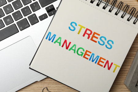 Notepad with text STRESS MANAGEMENT and laptop on wooden table, flat lay