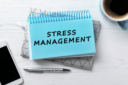 Text Stress Management in notebook on white wooden table with phone and cup of coffee, flat lay