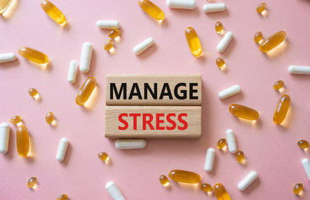 Manage stress symbol. Concept word Manage stress on wooden blocks. Beautiful pink background with pills. Medicine and Management stress concept. Copy space