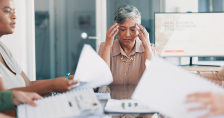 Headache, meeting and business woman stress, pain or anxiety, thinking of documents review. Burnout, fatigue or frustrated senior boss or manager in busy office with chaos of paperwork and team hands