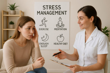 Doctor giving advice to her patient about stress management techniques, including exercise, meditation, enough sleep and healthy diet