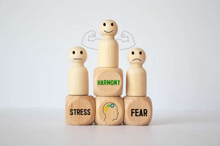 Hand stacking wooden blocks spells stress, symbolizing stress management and relief. Conceptual representation of time management and therapy in overcoming pressure and deadlines