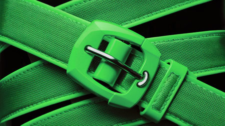 Close-up of a black leather belt with detailed stitching and a metallic buckle on a textured surface