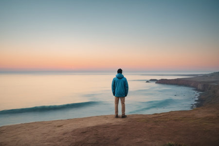 A contemplative man gazes out at the expansive ocean, reflecting on life and nature's beauty. The tranquil landscape invites moments of peace and solitude.