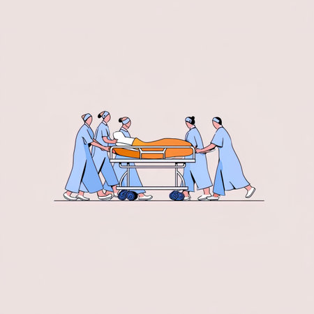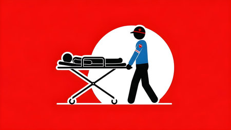 Medical personnel rushing patient on stretcher, motion blur conveys urgency and speed.