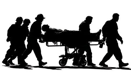 EMTs Loading a Victim onto a Stretcher into an Ambulance Silhouettes isolated on plain white background.