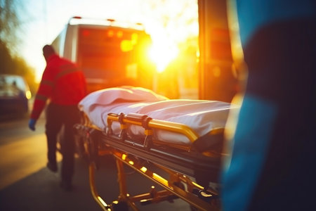 A team of emergency medical professionals administers urgent assistance to a patient by the ambulance under bright medical lighting during evening hours.
