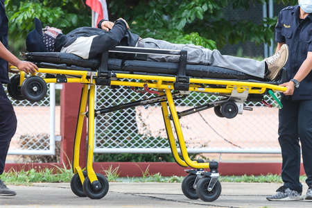 Emergency Medical First aid for head injuries of worker accident in work, Loss of feeling or loss of normal movement and Loss of function in limbs, First aid training to transfer patient.