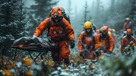 Rescue Team Evacuating Injured Person Through Snowy Forest