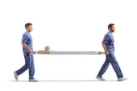 Full length profile shot of two male healthcare workers carrying an empty stretcher bed isolated on white background