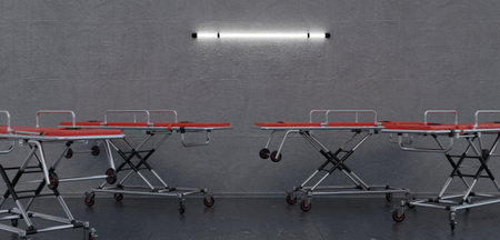 Modern medical transport unit features a sturdy stretcher ready for patient use, equipped with high-tech monitors and emergency tools to ensure quick medical response