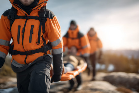 Mountain rescue team carries injured hiker on stretcher through rugged terrain. Morning light illuminates the scene, highlighting teamwork and determination.