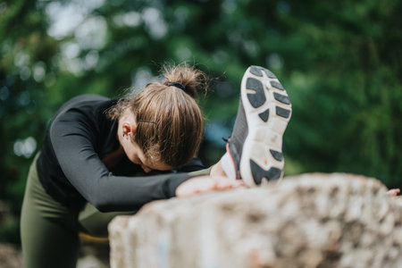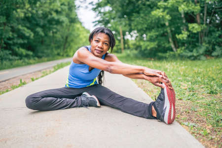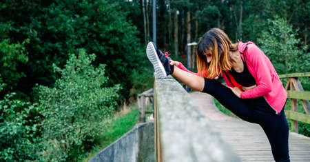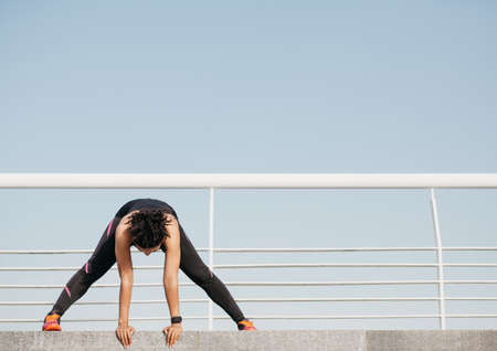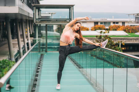 Sporty young woman doing stretching exercises while warming up before training outdoor.
