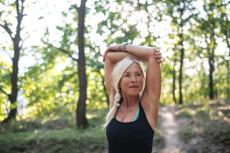 Young woman has an outdoor workout at the park. She is stretching her arms and looking away. Health care,