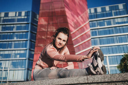 Young sporty woman doing a stretching exercise on the street. Modern lucky happy casual joggers are stretching at park.