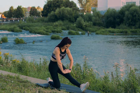 A girl with a hairstyle of many braids does a stretch at sunset against the background of the river in the city.