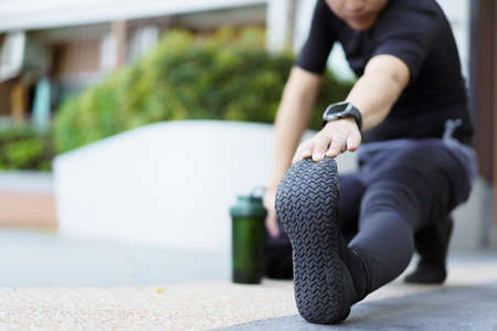 Close up Asian young athlete sport runner black man wear watch he sitting pull toe feet stretching legs and knee before running at outdoor street health park, healthy exercise before workout concept