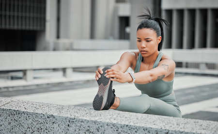 Young mixed race hispanic female athlete stretching her leg before a run outside in the city. Exercise is good for your health and wellbeing. Stretching is important to prevent injury