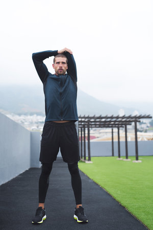 Sports and recreation concept a male youth doing warm-up by stretching each part of his body as preparation before exercise.