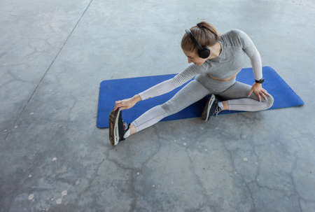 Young caucasian blond fitness woman is exercising stretching while sitting on a mat on a concrete floor. healthy lifestyle