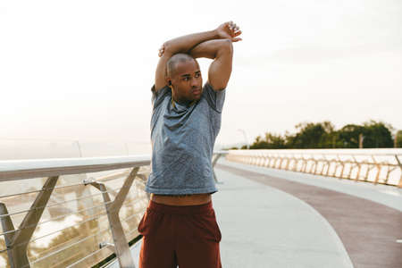 Fit african american young man stretching his arms and shoulders to warmup before a run outside. Serious handsome athlete stretching his body before exercising as he listens to music on his earphones