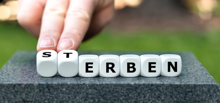 Hand turns dice and changes the German word 'Sterben' (die) to 'erben' (inherit).
