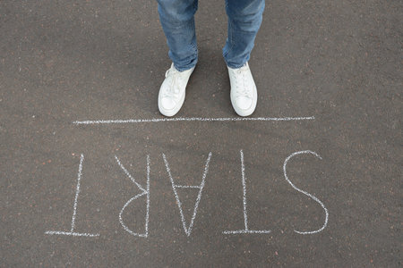 lettering word starting and shape of space rocket on foggy glass window on blue background