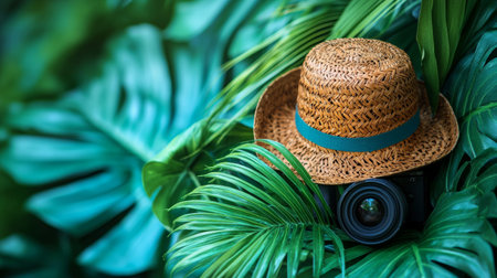 A travel-themed composition featuring a straw hat and tropical leaves, creating a bright and inviting summer vibe.