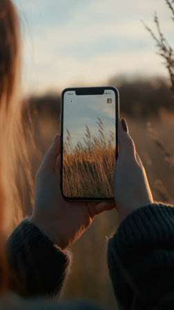 Woman captures natures beauty at sunset in a field using her smartphone, embracing the golden hour and sharing the serene landscape online