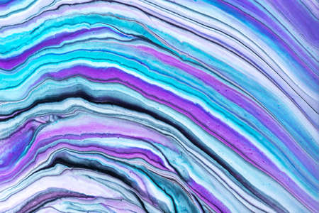 Abstract fluid art background light blue and purple colors. Liquid marble. Acrylic painting on canvas with turquoise gradient. Watercolor backdrop with striped violet pattern. Stone section.