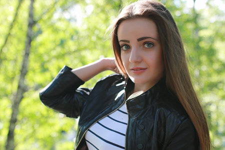 Young girl on a walk. Girl in a leather jacket on the street. Be