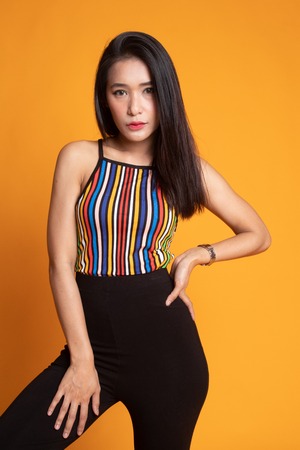 Portrait of beautiful young Asian woman in colorful shirt on yellow background
