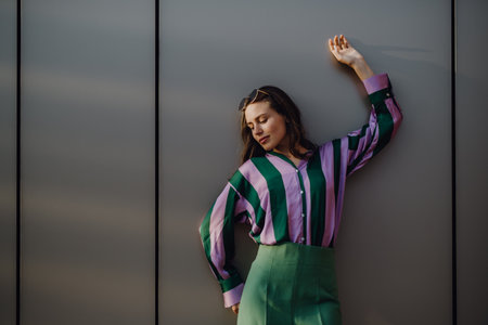 Young woman with a unique style smiles confidently, wearing a vibrant striped sweater against a bright orange background, capturing a sense of joy and individuality